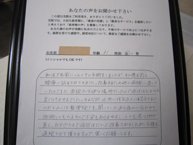 ◆患者様に寄り添い、痛みの状況等のお話しを詳しくお聞かせ頂き、最終的に根本改善を目指します。